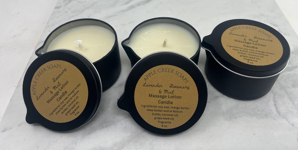 This cute tin is 4 oz. and has a spout for pouring. It has natural ingredients including: Mango Butter, Shea Butter, Kokum Butter, Coconut Oil, Soy, Palm oil, Grape Seed Oil, and Fragrance.